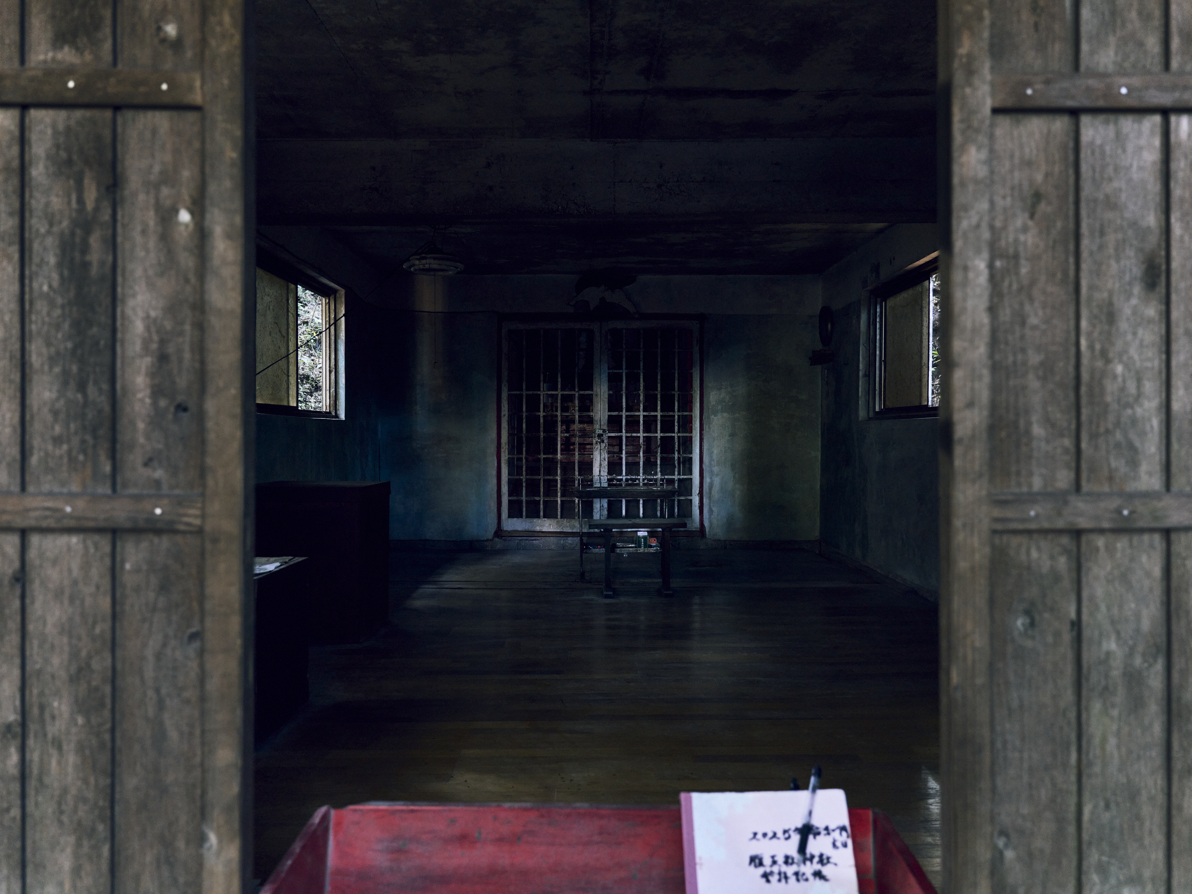 ノート, ペン, 本殿, 机, 格子状の扉, 椅子, 照明, 窓, 賽銭箱