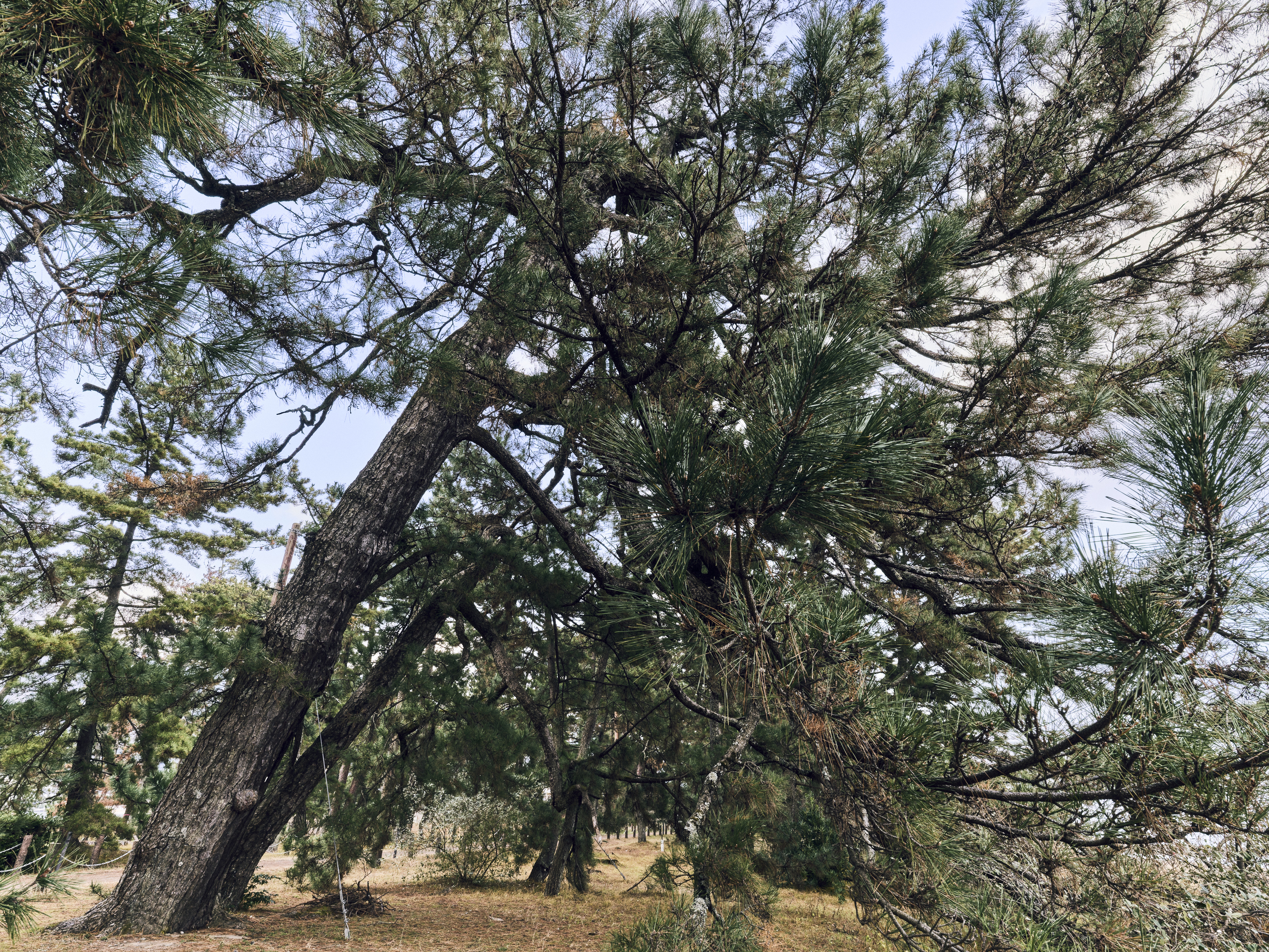 天橋立にて。風に煽られ、くの時に幹を曲げる松。