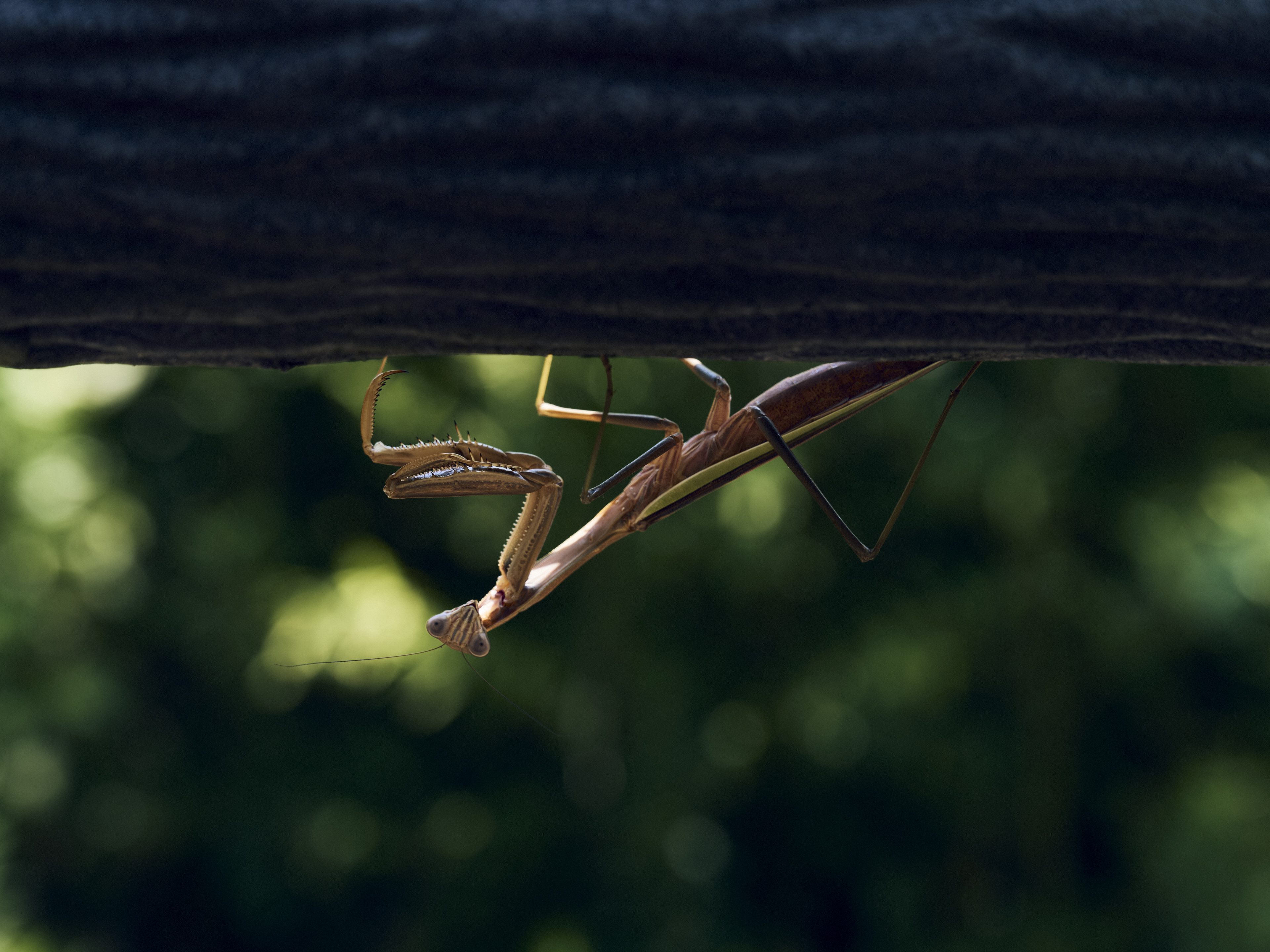 逆さに世界を見つめるカマキリ