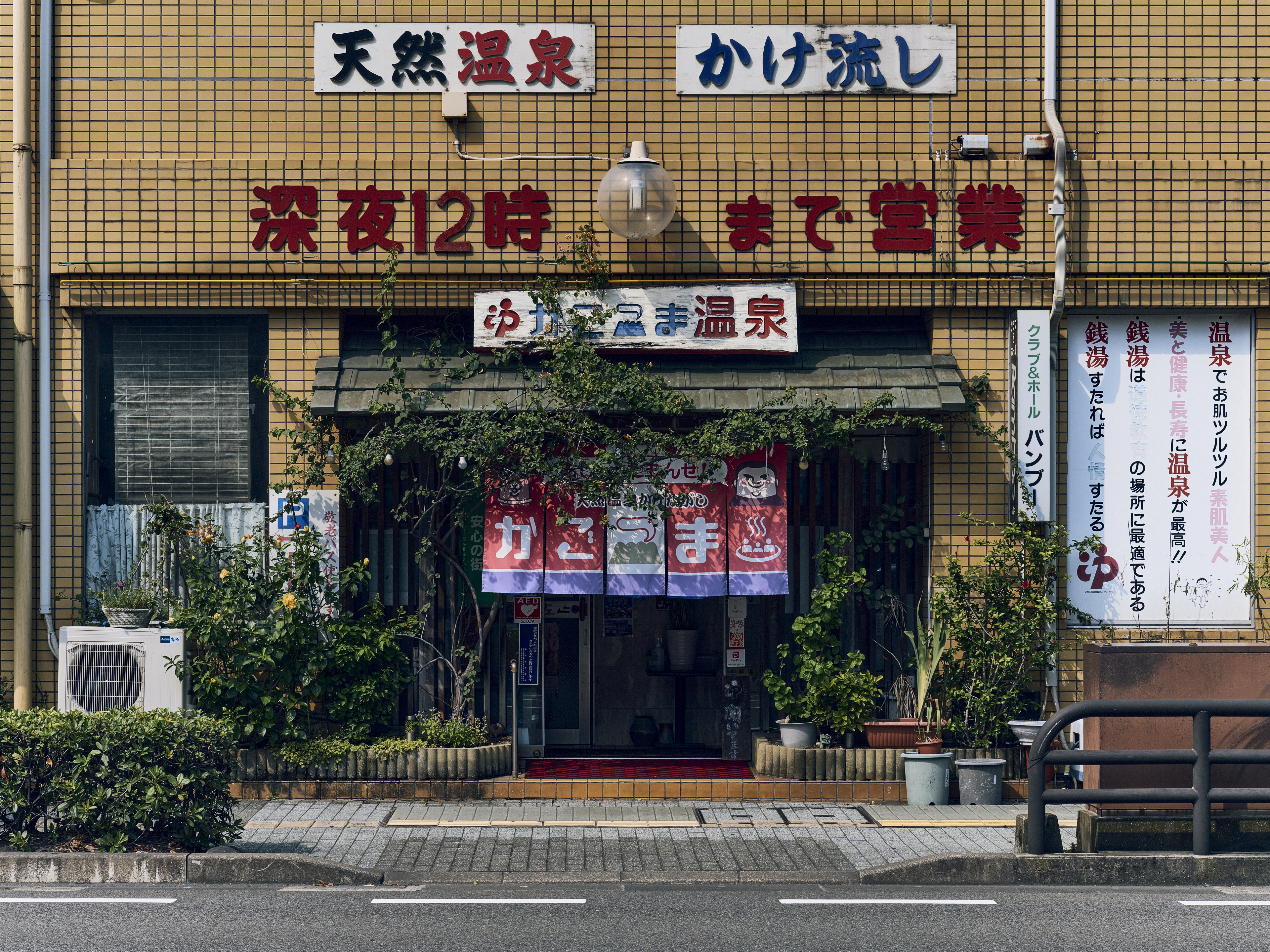 エアコン室外機, タイル, のれん, 建物, 手すり, 植物, 照明器具, 看板, 窓, 道路