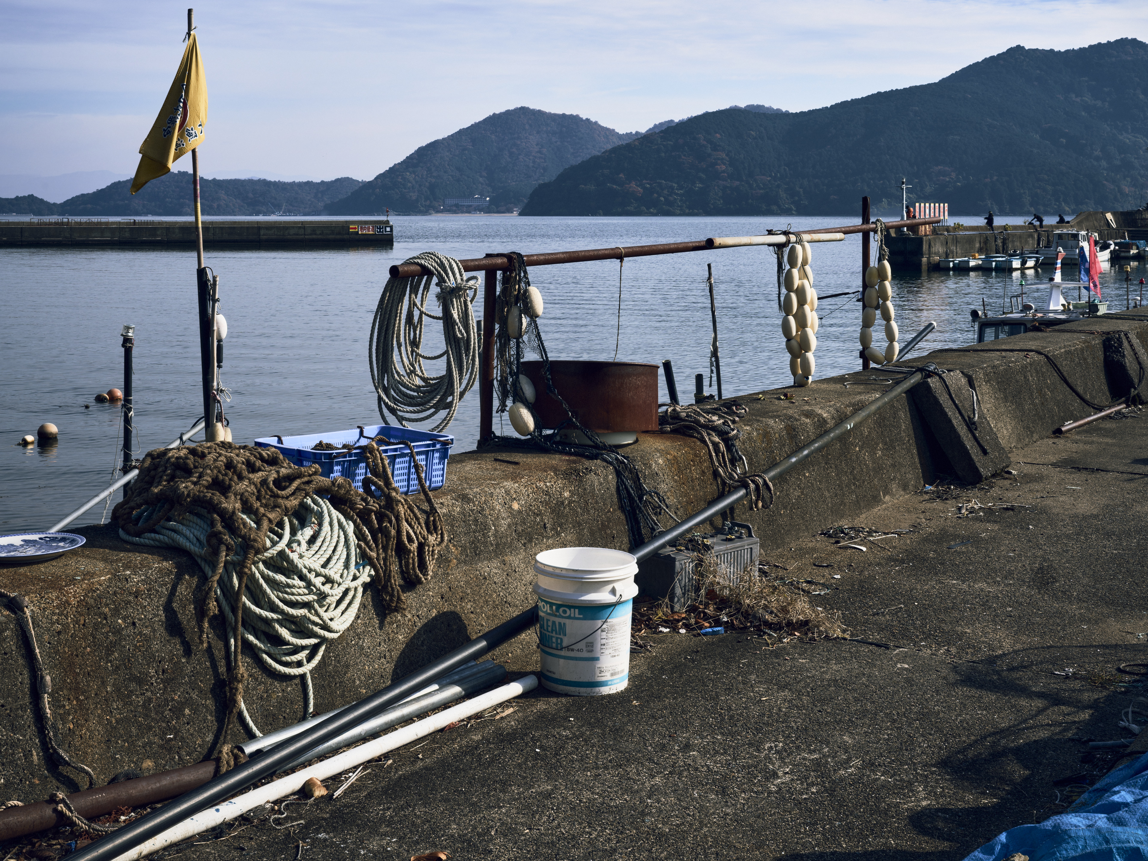 防波堤に並べられた漁具や道具たち。公共と私的領域が曖昧に重なりあっている。