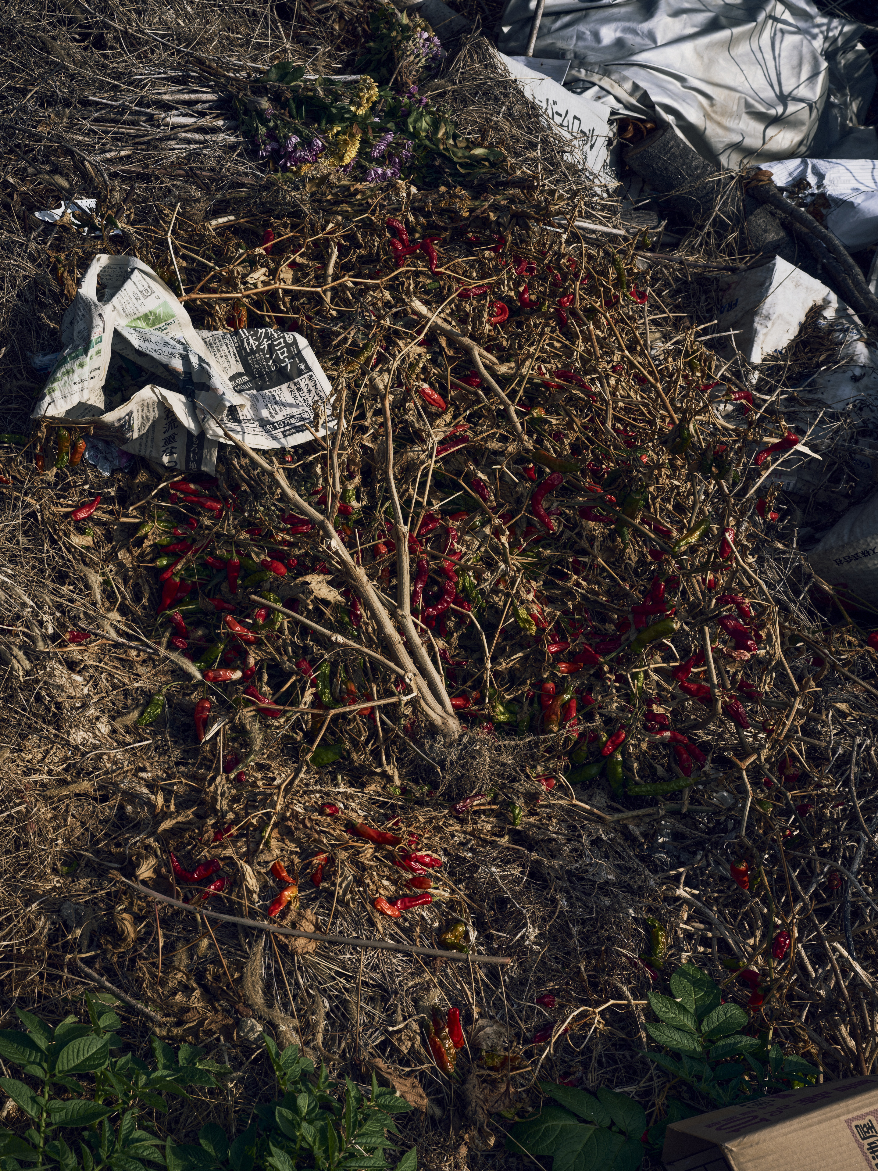 枯れ草の上に赤唐辛子が散り、新聞紙や段ボールが入り交じる。