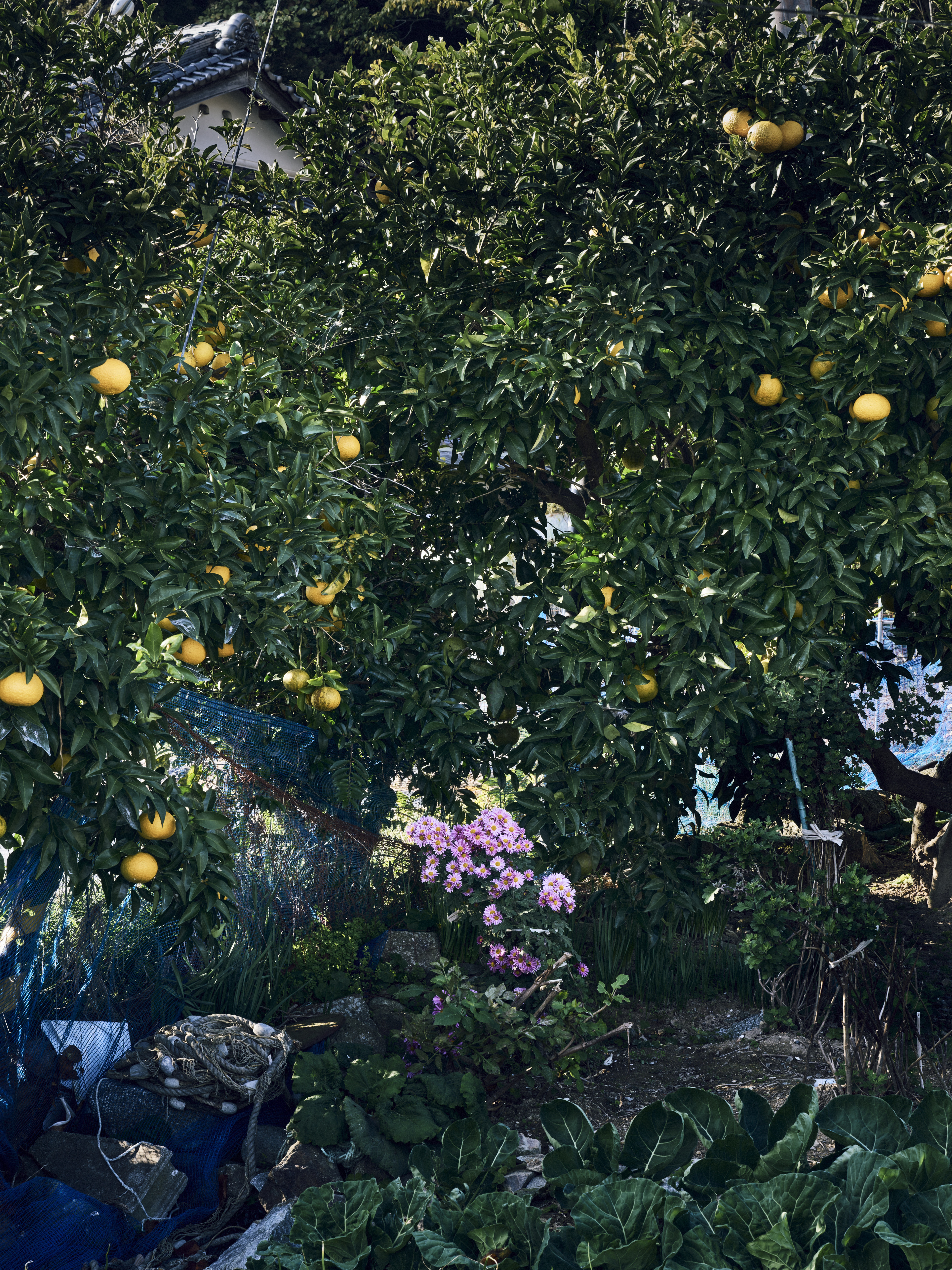 家屋の前にある畑の端に夏みかんの樹木が植えられ、足元にコスモスが咲いている。手前にはチンゲン菜のような野菜が植えられていた。