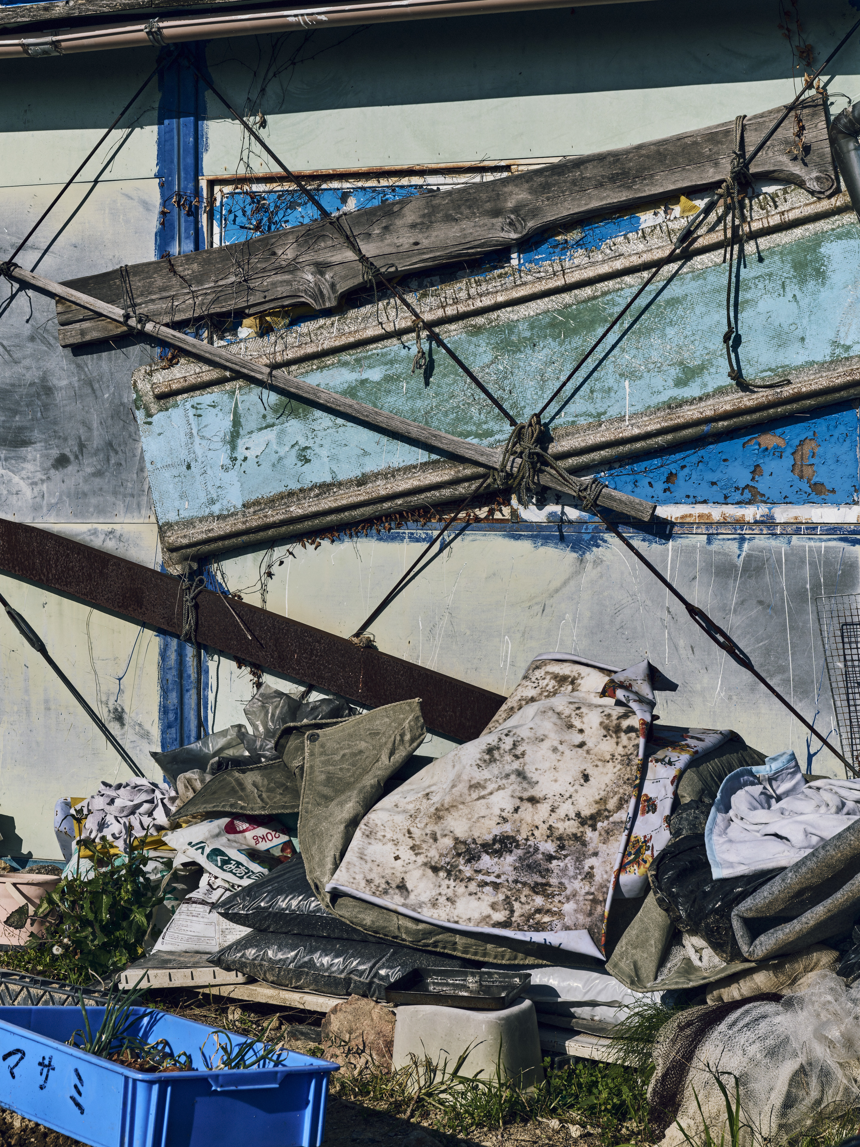 畑の傍にある建物の壁に木の板やロープが交差し、手前にはビニールシートや布、コンテナ等が積まれている。光が強く当たり、それぞれの形が平面に焼き付けられている。