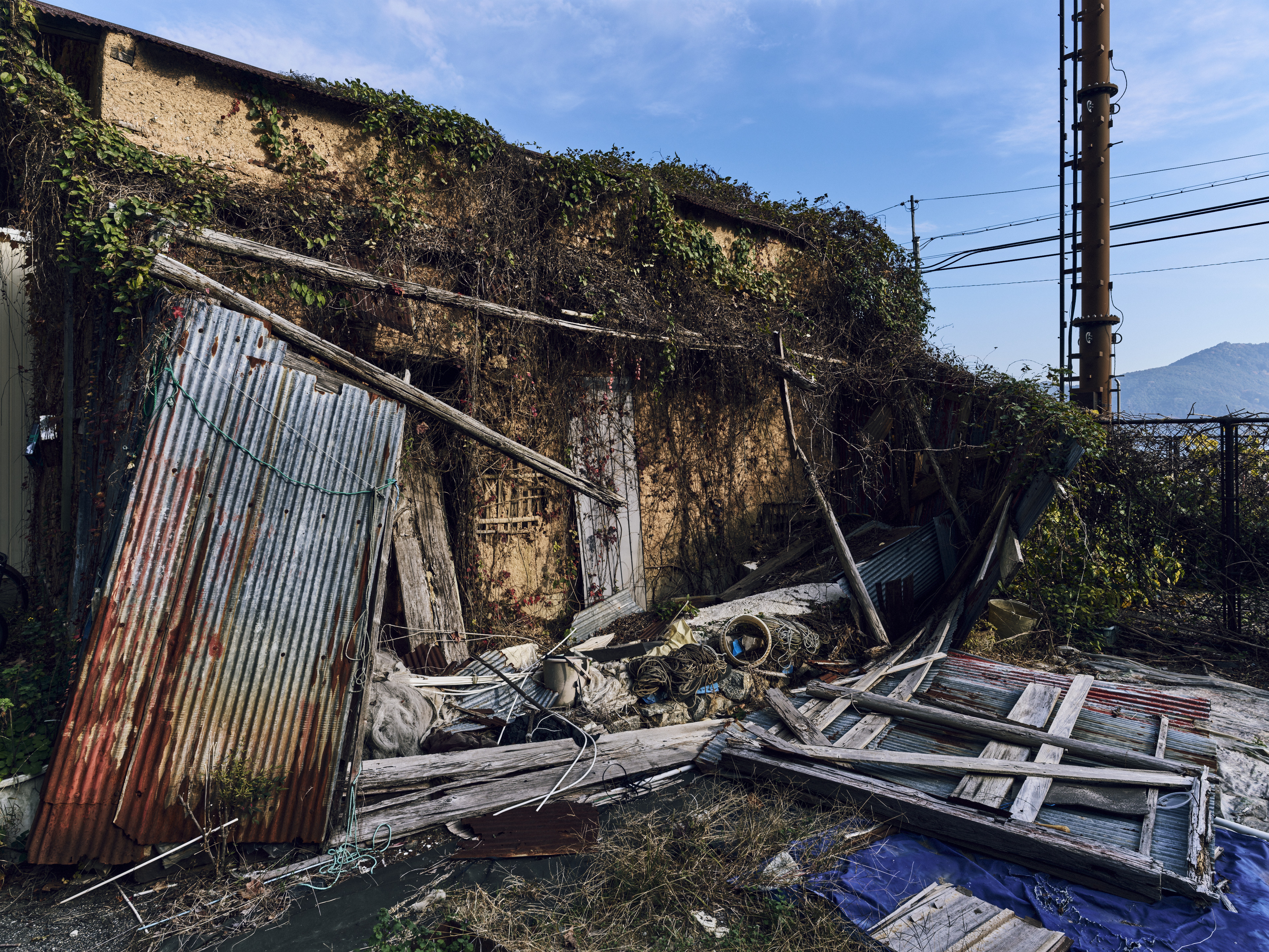 ツタ, トタン板, ビニールシート, フェンス, ロープ, 廃材, 草, 電柱, 電線