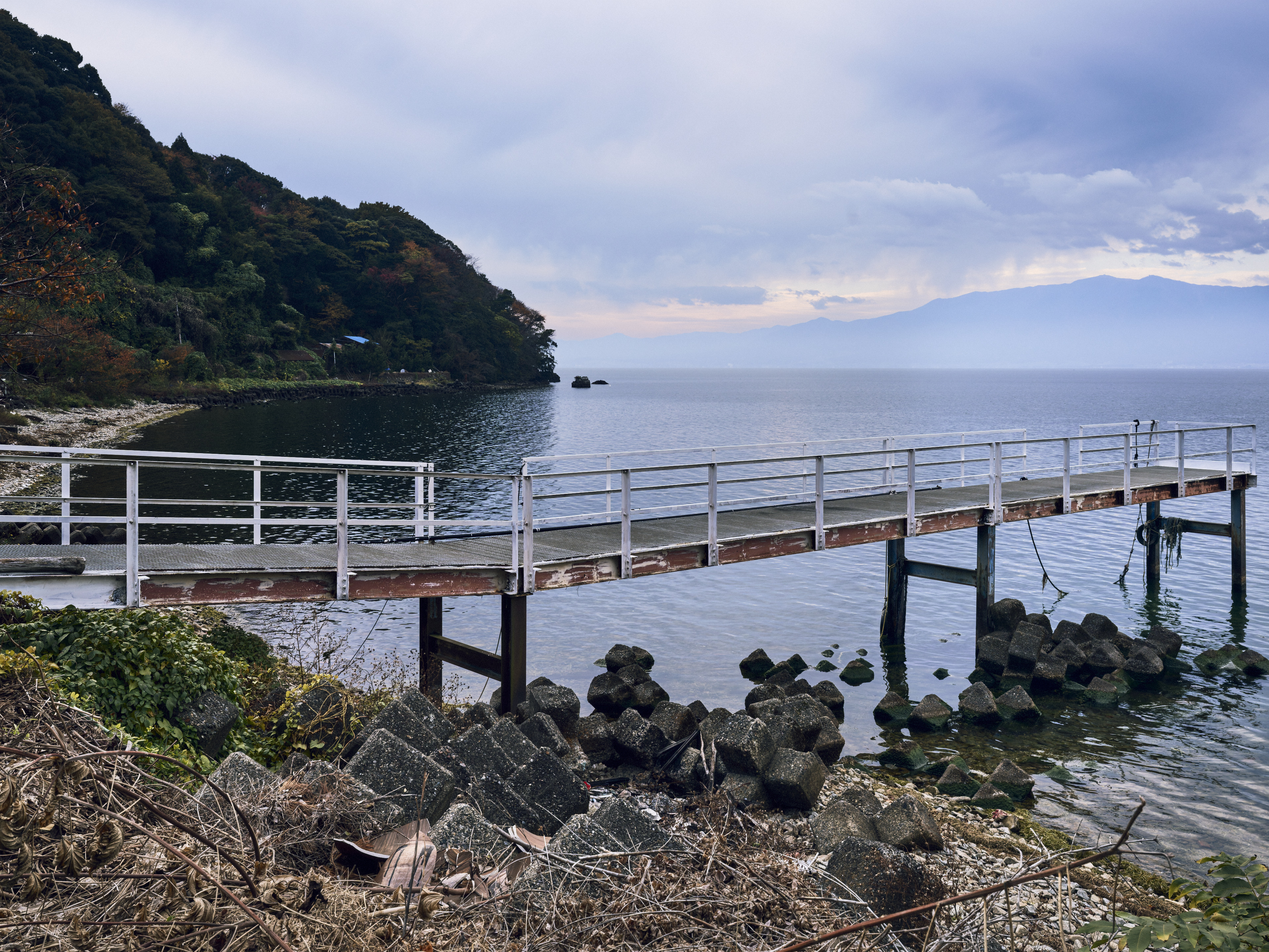 琵琶湖へ伸びる桟橋。穏やかな湖面。雲の多い空。