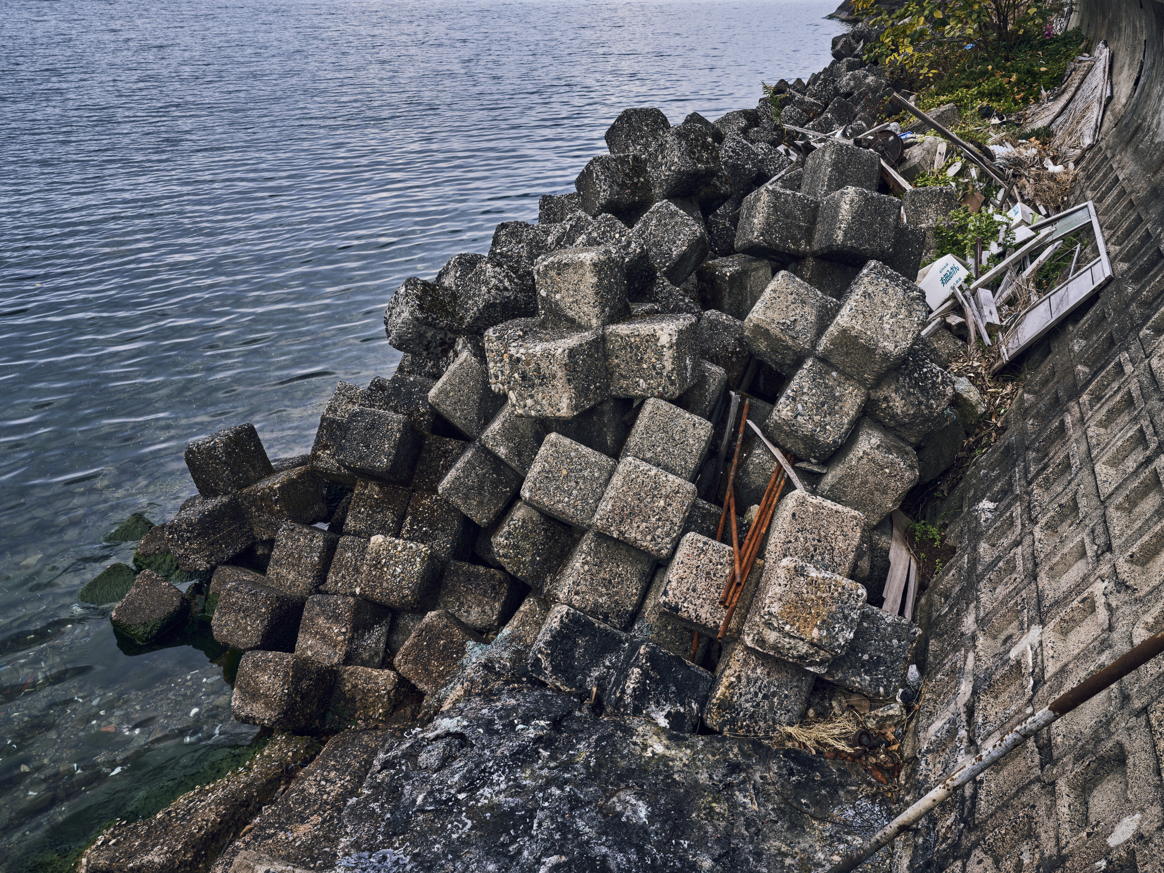 植物, 消波ブロック, 湖, 鉄パイプ