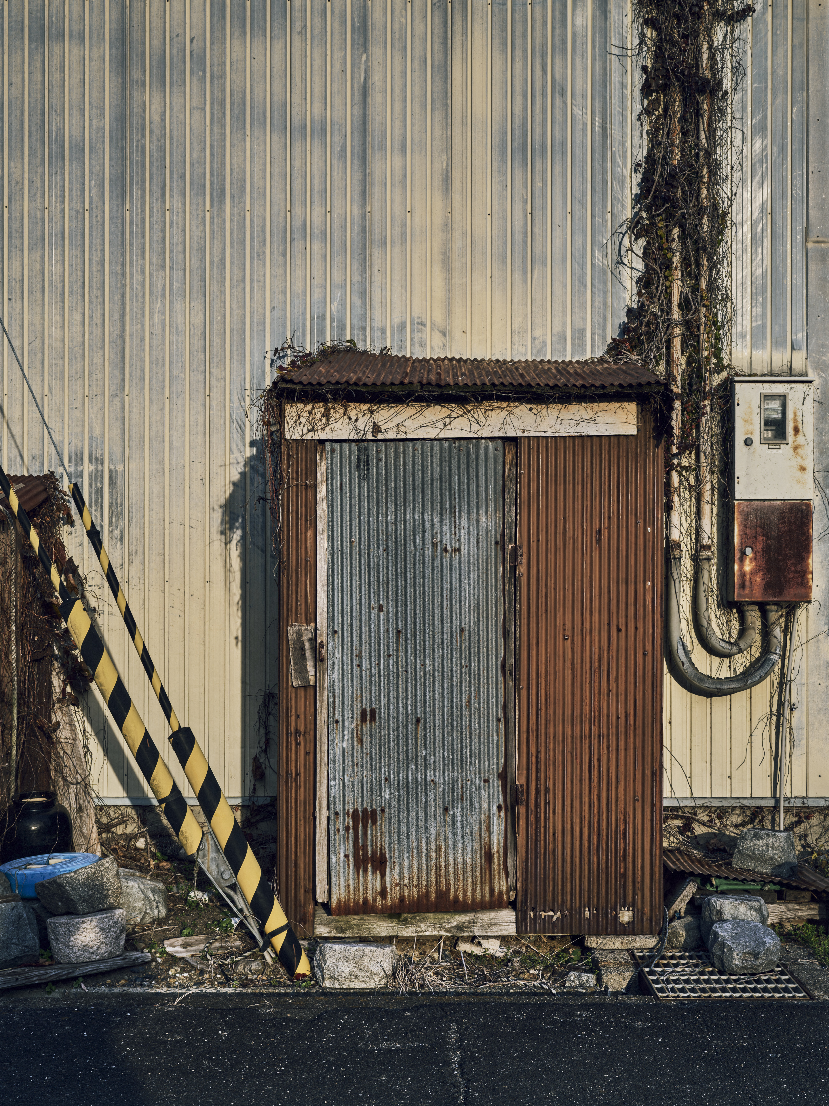 夕刻。沖島の地元漁民が使っている倉庫の脇にあるトタン板でできた小屋のようなもの。電気メーターから出ている配管に枯れたツタが絡まっている。