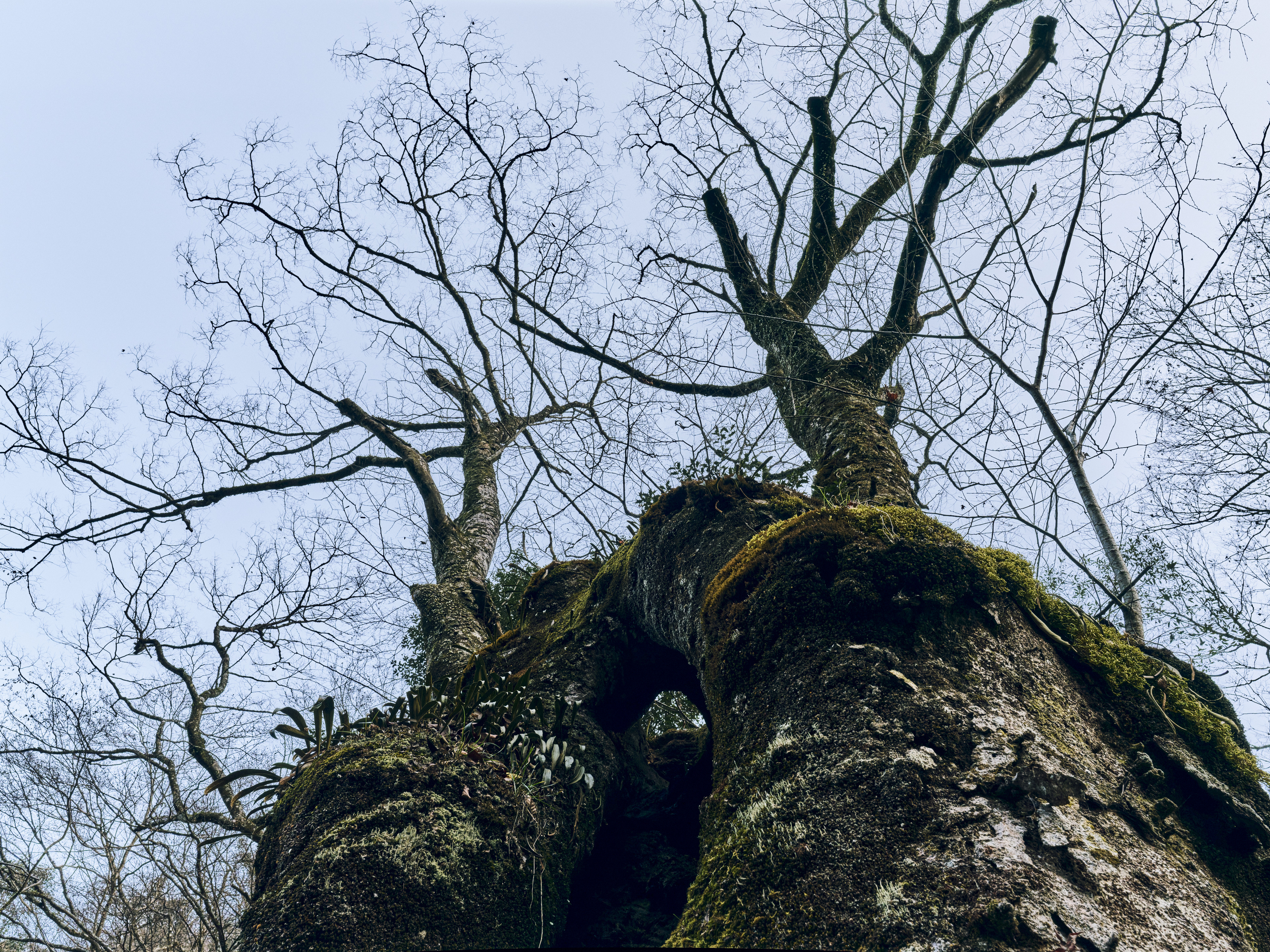 冬の空へ枝を伸ばす幹に空洞のある桜の古木。