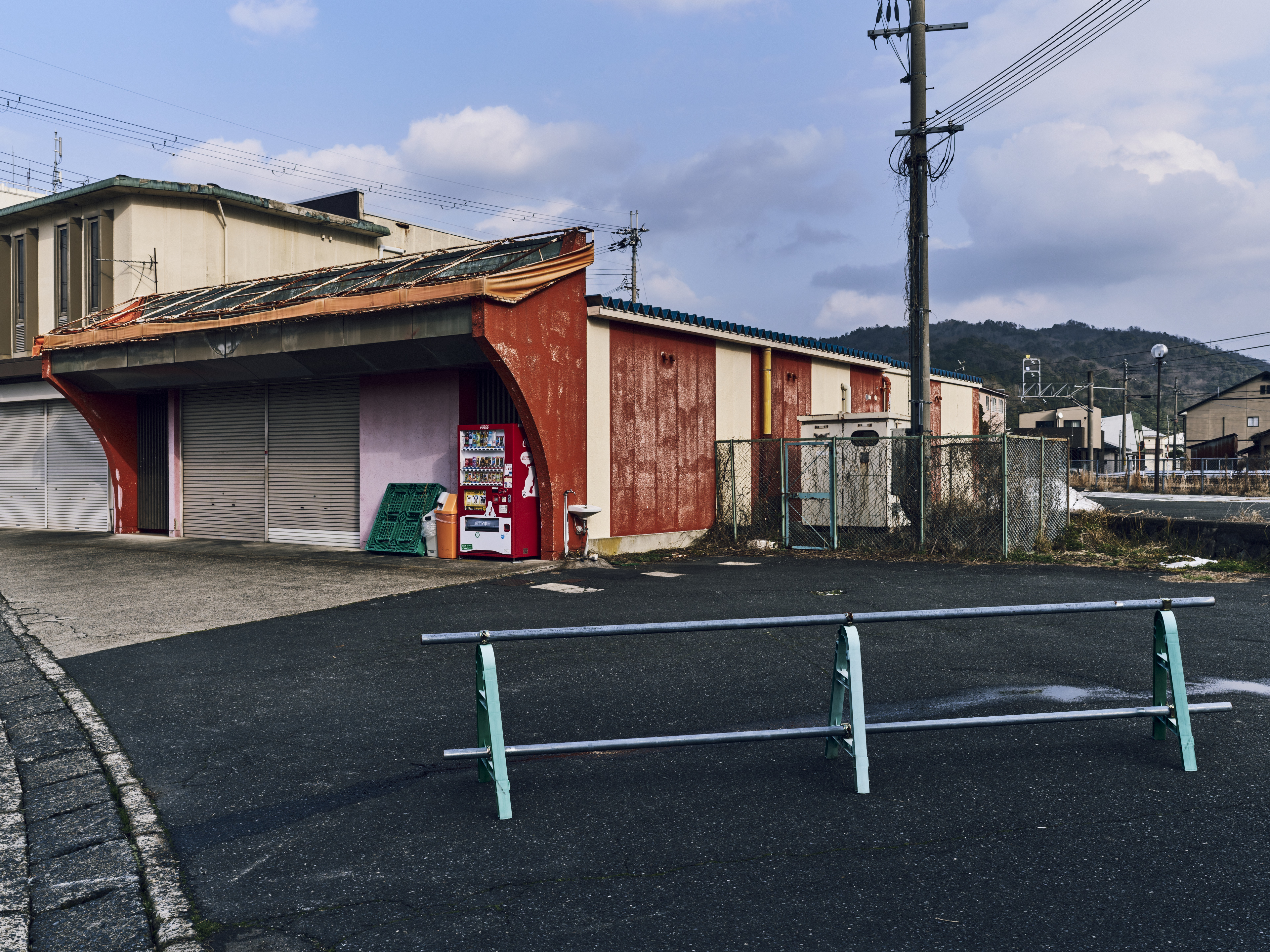 ガードレール, シャッター, フェンス, 山, 建物, 空, 自動販売機, 軒先テント, 軒先テントフレーム, 道路, 雲, 電柱, 電線