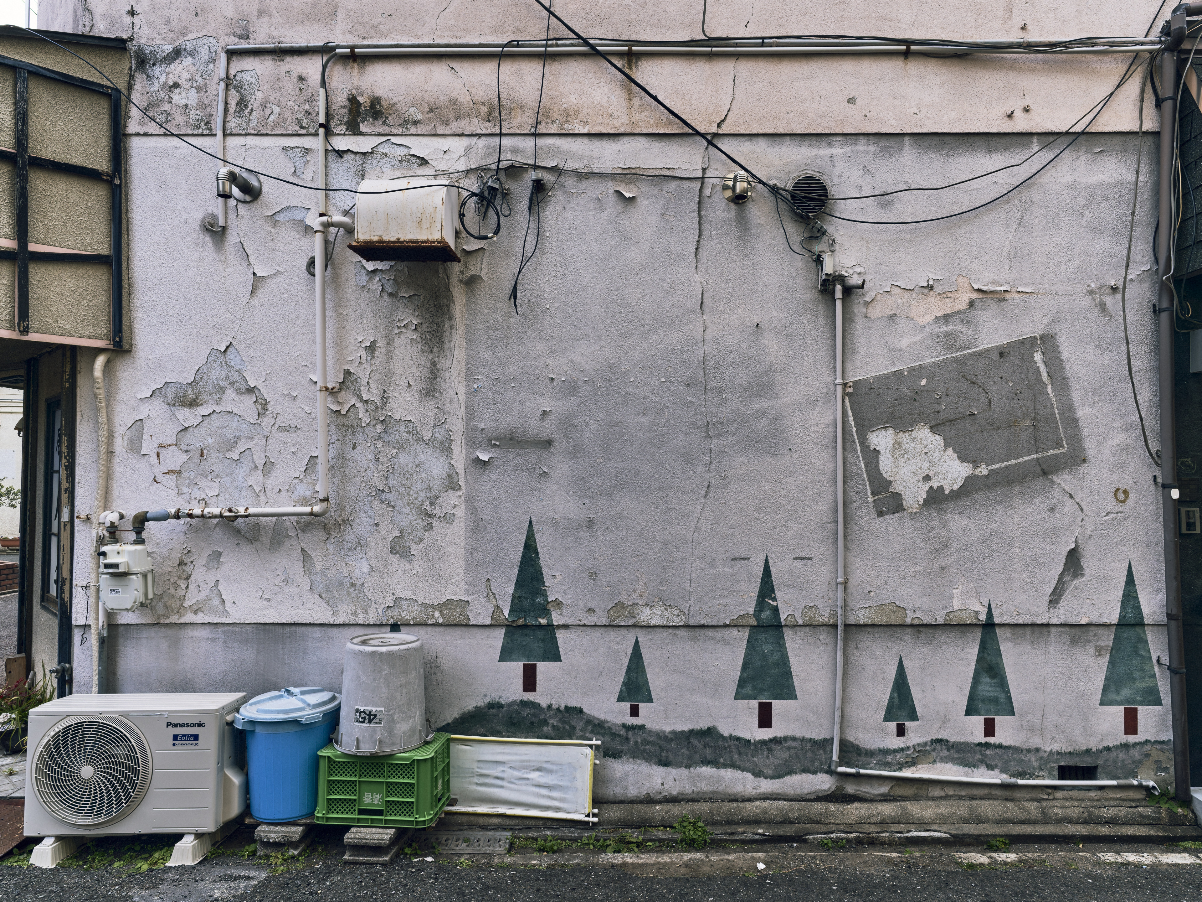 エアコン室外機, バケツ, プラスチックコンテナ, 壁, 換気口, 配管, 電線