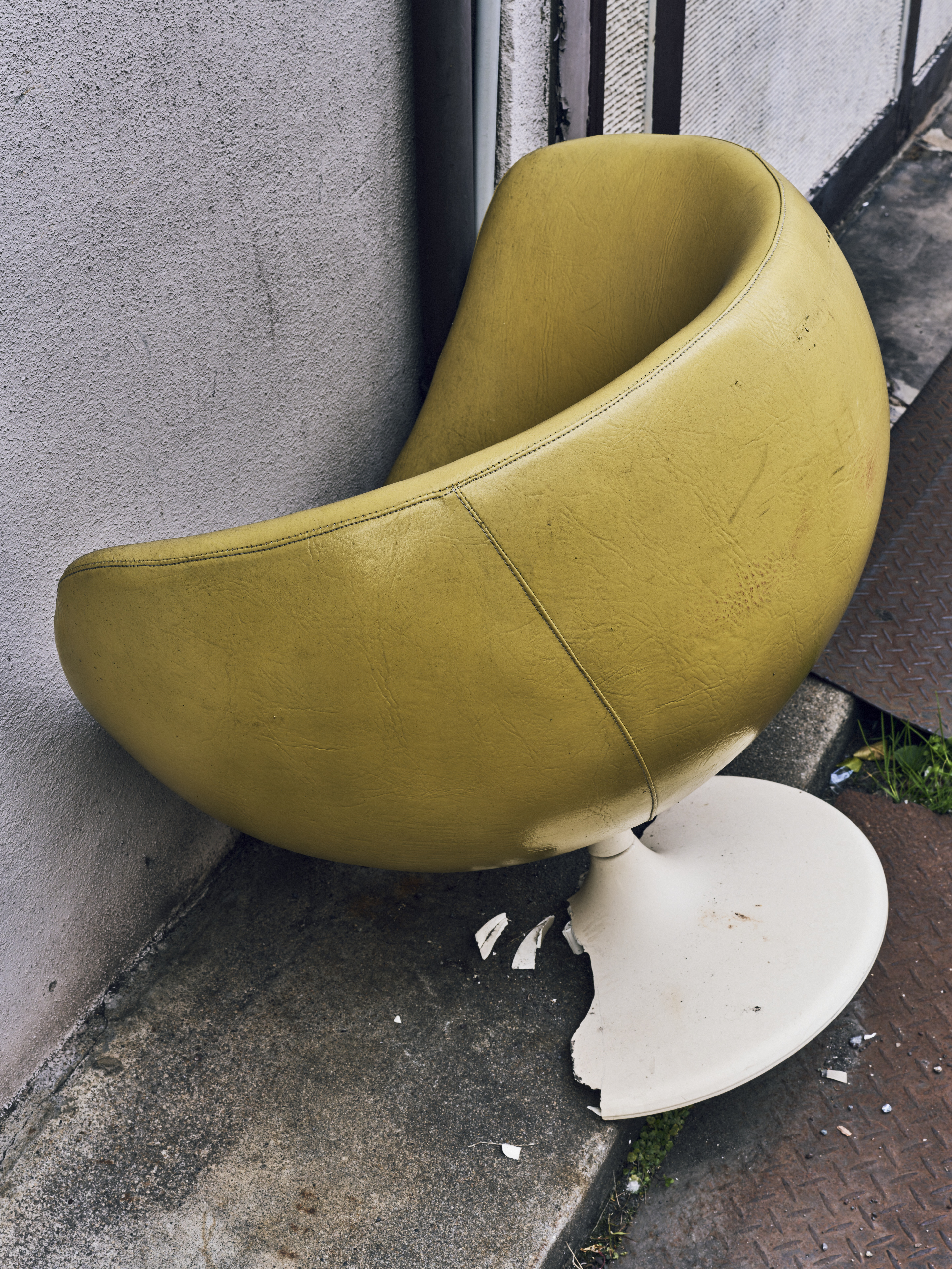 黄色くて丸いスツールが店舗の外に置かれていた。多くの夜を越えたであろうこのスツールは、台座部分が欠けたため廃棄されるのだろう。