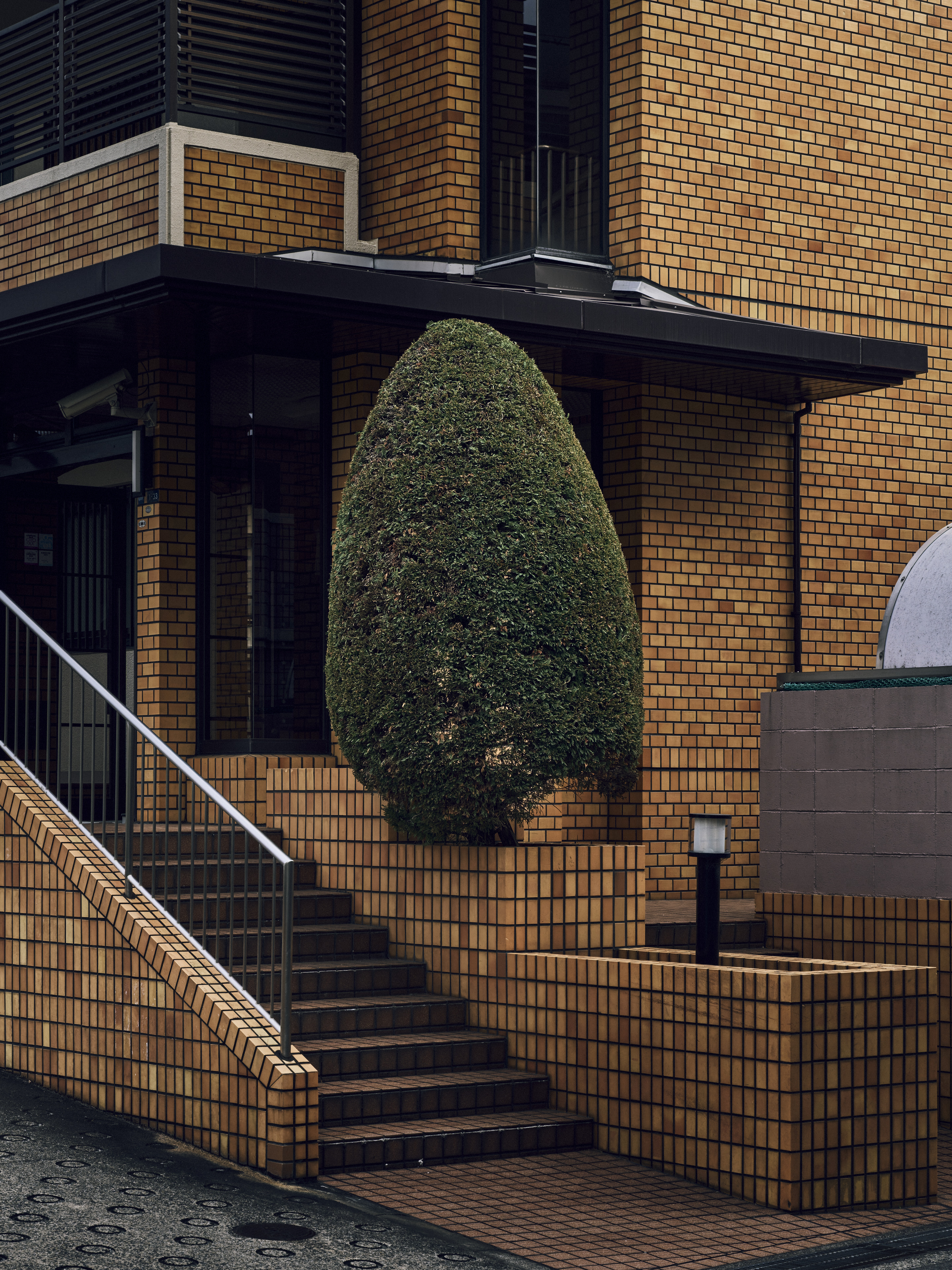 マンションの入り口付近。人工物に囲まれ、人工的な造形を強制された樹木。